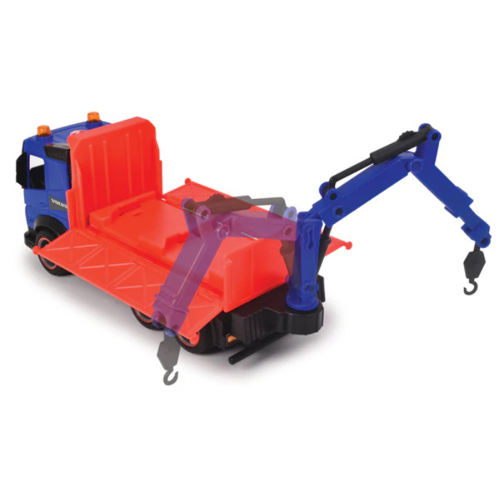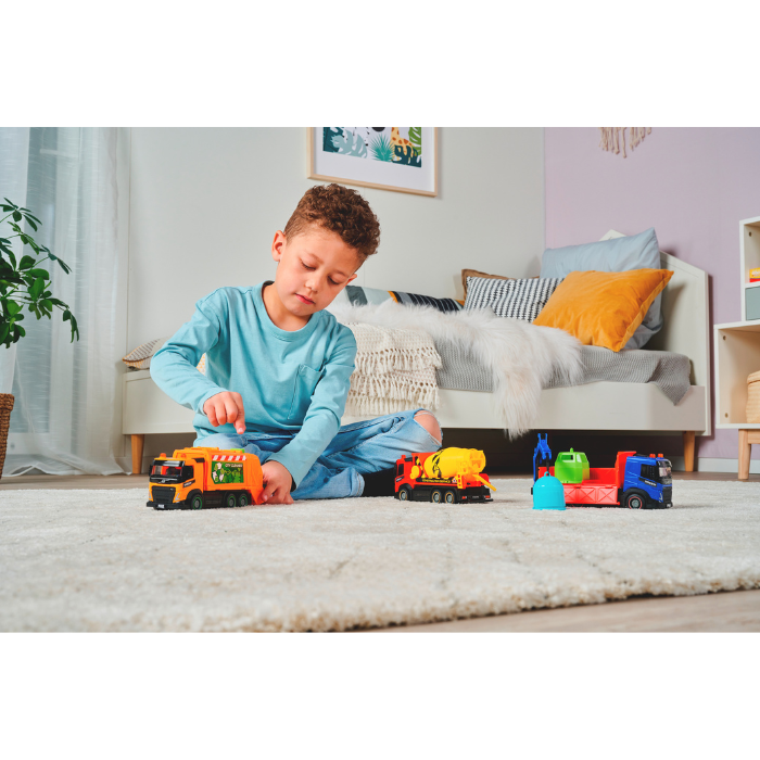 Dickie Toys – City Trucks – Three different designs. The Dickie Toys City Trucks are a fun way to teach your little one about the tasks performed by different types of vehicles. There are three different models available. The trucks are shipped at random, and it is not possible to request a specific model. Cement mixer: Fill the drum via the funnel and turn the wheel to empty the contents. Refuse vehicle: The refuse vehicle features a loading ramp that is operated via the button on the roof of the vehicle. There is also an additional flap on the roof. The container can be titled to unload the refuse. Recycling truck: Removable glass container, moving crane arm for loading and unloading, containers with lid for filling and emptying. Realistic Volvo design. The vehicle is modelled on a Volvo FM Truck and features a large Volvo logo. It is available in three designs: a refuse vehicle, a concrete mixer and a recycling truck with a crane arm.