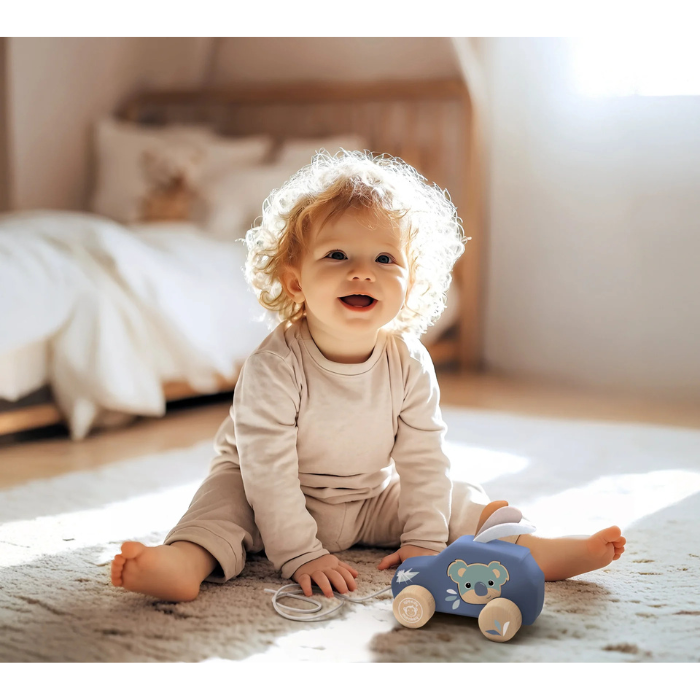 Colorful wooden pull-along car encourages balance, coordination and imaginative play.