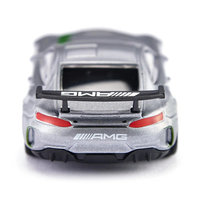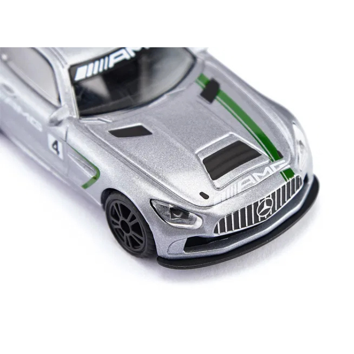 Motor racing under the sign of the star. A loud rumbling announces the presence of the 4.0 litre V8 bi-turbo engine. The Mercedes-AMG GT4 transmits up to 510 HP to the rear axle. Its construction makes the sports car from Affalterbach perfect for participation in sprint and long distance races organised under GT4 rules. The almost-series motor sports racer with the star is presented by siku in its original paintwork, just like the roll-out for the 24 hour race of the Spa-Francorchamps 2017. The powerful rear spoiler provides downthrust to the rear axle.