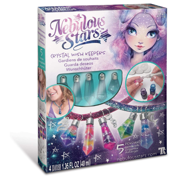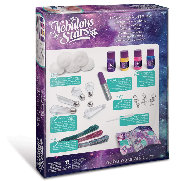 This jewelry making kit includes: 5 crystal-shaped bottles, Tube of glitter powder, 4 bottles of ink, 3 charms, Sparkling ribbon, Cotton balls, Plastic pipette, Color instructions, Nebulia’s story pamphlet
