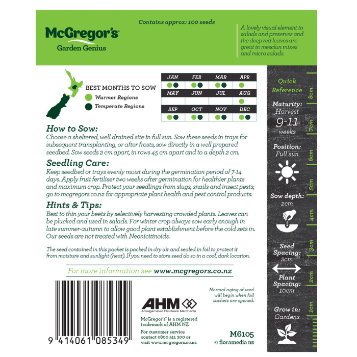 Hits & Tips: Best to thin your beets by selectively harvesting crowded plants. Leaves can be plucked and used in salads. For winter crop always sow early enough in late summer-autumn to allow good plant establishment before the cold sets in.