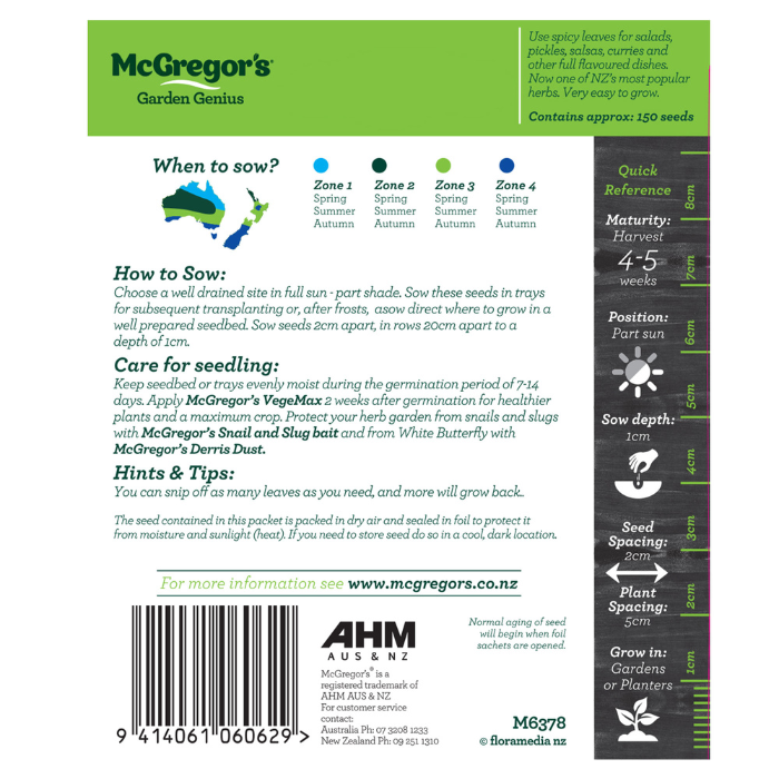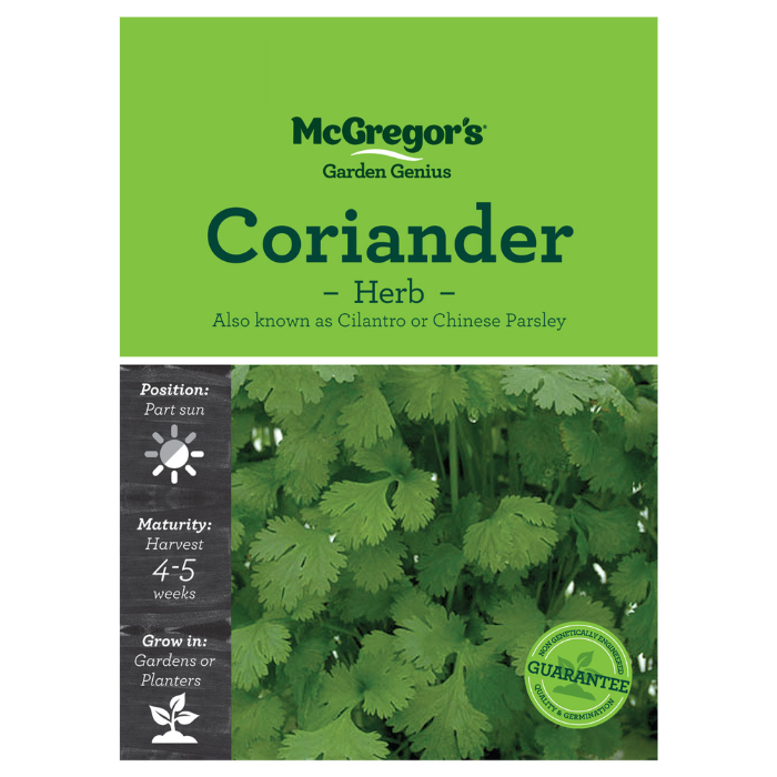 Also known as Cilantro or Chinese Parsley. Use spicy leaves for salads pickles, salsas, curries and other full flavoured dishes. Now one of NZ's most popular herbs. Very easy to grow.