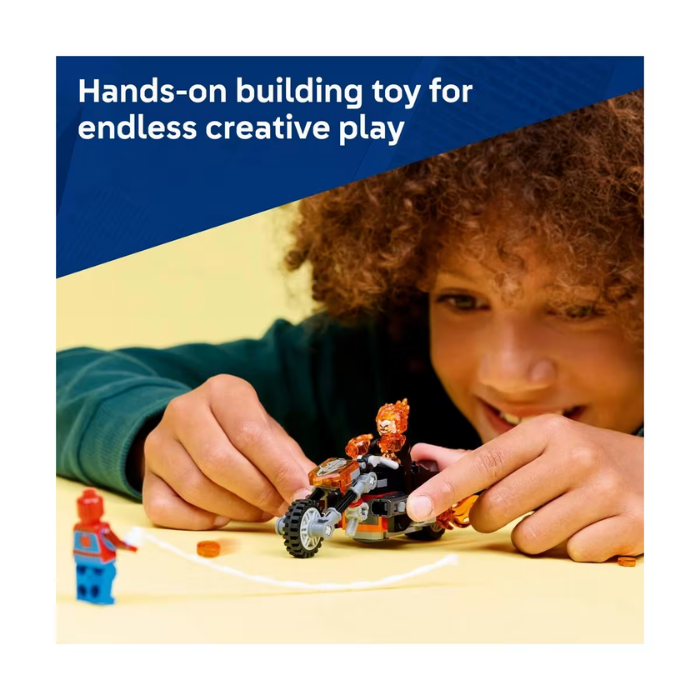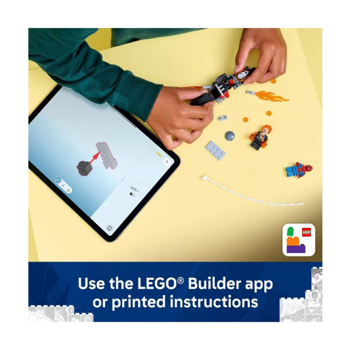 The Ghost Rider minifigure is depicted as a skeleton with flames streaming from his hands and head. His iconic motorcycle features two flaming exhaust pipes and two built-in stud shooters. The Spider-Man minifigure’s web-rope attaches to the motorcycle, offering endless role-play possibilities as the characters battle on and off the high-octane vehicle. This building set makes a great gift idea for the birthdays of young Superheroes, LEGO builders and fans of collectable Spider-Man merchandise. And, with the LEGO Builder app, kids can build with confidence - zoom, rotate in 3D and track progress with easy-to-follow digital instructions. Building set contains 72 pieces.