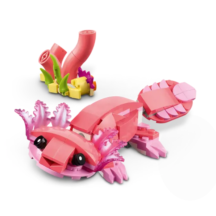 This LEGO set gives kids 3 different building options using the same bricks: a pink flamingo toy with a posable head on a plant-covered stand, a posable pink cockatoo toy, which can rotate its head 360 degrees, or an adorable posable pink axolotl toy with underwater plants. All 3 cute LEGO animal transforming toys make fun gifts for kids.