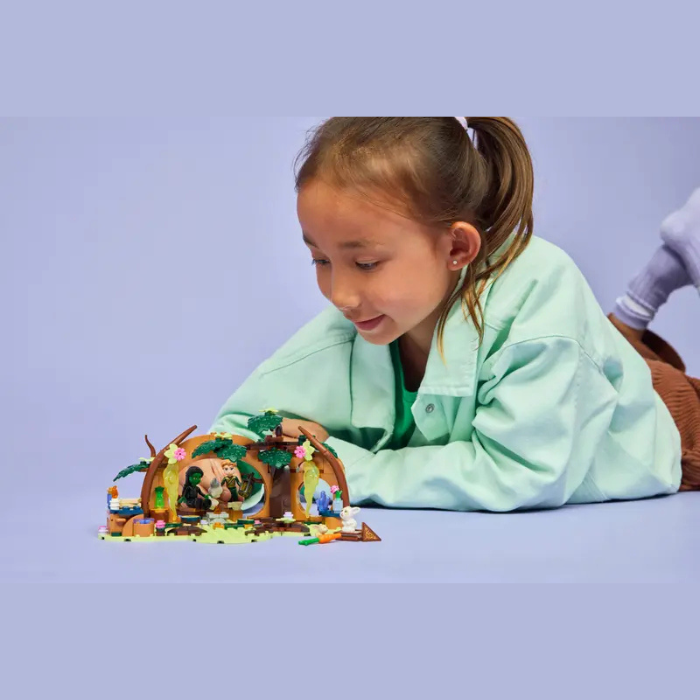 Girls, boys and Wicked fans recreate a special movie moment as they build Elphaba's toy forest hideout in LEGO® bricks. This building toy for kids is packed with details to spark imaginative play. Wicked movie fans will recognize the poppy Fiyero gives to Elphaba pressed inside Glinda's book. As they set up tea and cups and settle in around the fireplace, storing the Grimmerie away safely in the desk.