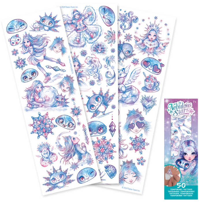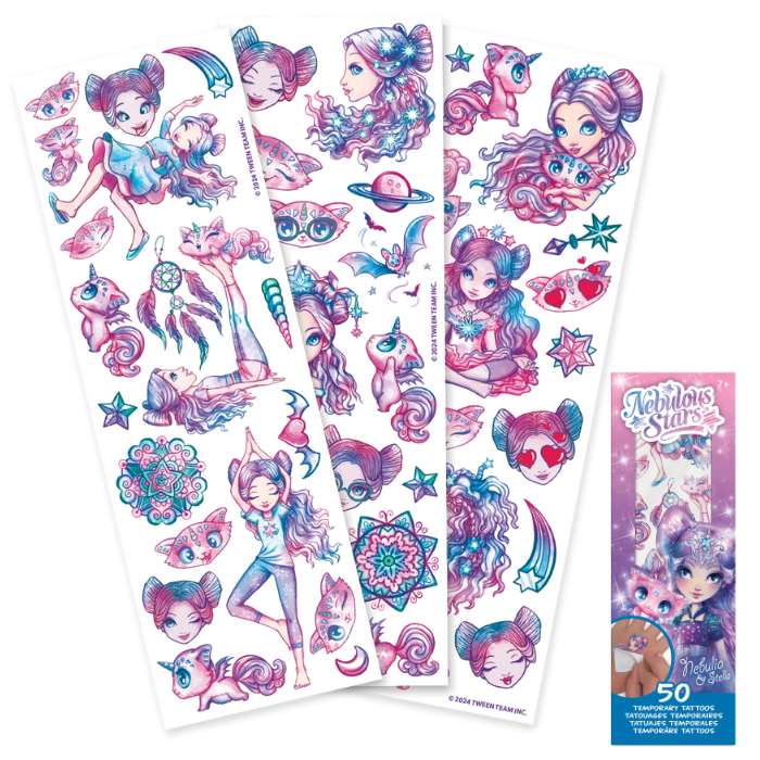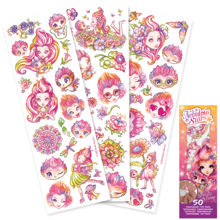 50 small temporary tattoos made of original illustrations inspired by your favorite character.