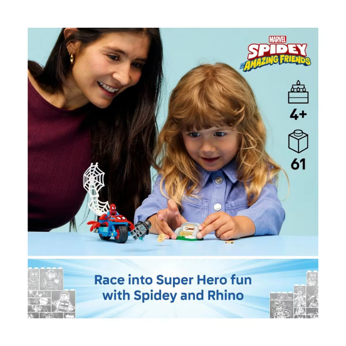 Spidey and Rhino Minifigures - Inspire young builders and Marvel fans with an action-packed toy featuring 2 minifigures, a motorbike and a LEGO Starter Brick to make building fast and fun