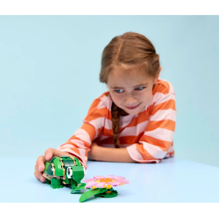 LEGO® Creator 3 in 1 Turtle with a Water Lily Flower (31377) building set lets kids ages 7 and up play out creative animal stories. This cute animal toy for girls and boys offers 3 different building options with the same set of bricks. Kids can choose to build a turtle toy with a posable head and mouth, which comes with a beautiful pink water lily flower. This can then be rebuilt into a chameleon lizard toy with a posable head and tail, or a frog toy with a moving mouth. Once playtime is over, each model can be displayed as fun room decor. This LEGO Creator 3 in 1 set will inspire kids’ imaginations and makes a great value cute gift for girls and boys who love pretend play and wild animals. And with the LEGO Builder app, kids will experience an easy and intuitive building adventure. They can zoom in and rotate their sets using 3D building instructions, track their progress and save them in one place. Please note models cannot be built simultaneously. Set contains 124 pieces.