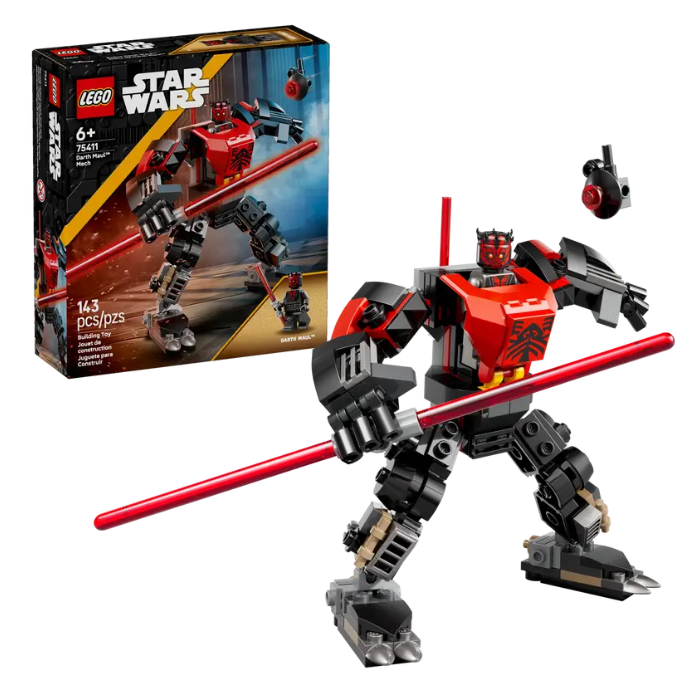 - Darth Maul LEGO® Star Wars™ minifigure – The LEGO minifigure of this iconic Star Wars character comes with a double-bladed red Lightsaber™ that can be clipped to the back of the mech