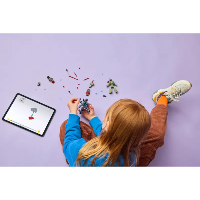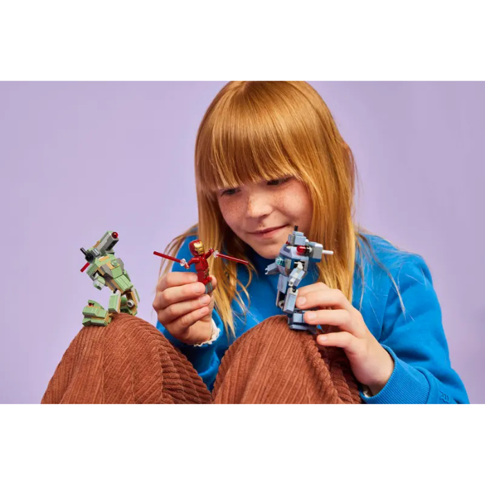 This buildable toy recreates the epic battle scene from Marvel Studios’ Iron Man 2 film. It comes with Iron Man and War Machine minifigures and 2 buildable Hammer Drones. The Hammer Drones are fully jointed so kids can pose the buildable figures for realistic dynamic play. The green Hammer Drone has a spring shooter on its shoulder. The blue Hammer Drone has a push shooter on each shoulder. War Machine has red hand and feet blasters and a stud shooter on his shoulder. Iron Man has blue hand and feet blasters and can hold laser beam elements. For added digital fun, builders can zoom in, rotate models in 3D and track their progress using the intuitive LEGO Builder app.