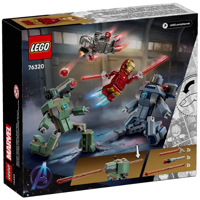 - Iron Man and War Machine minifigures with hand and feet blasters and weapons