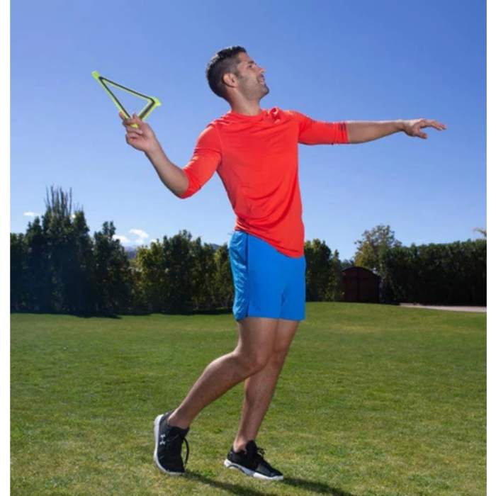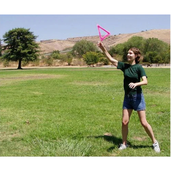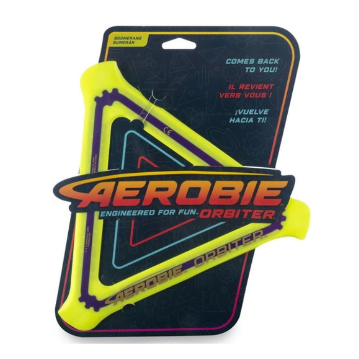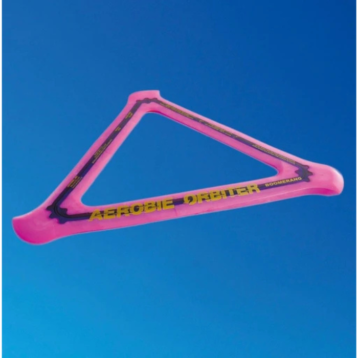 A high performance outdoor boomerang, the Aerobie Orbiter flies in a large circle and then it really does come back. Its high tech triangular design and bright colored, soft rubber edges make it secure to throw and easy to see in flight and also soft and easy to catch. Throwing instructions printed on the boomerang will help you learn to play catch with yourself in no time. Size: 11.5 inches (29cm) per side, equilateral triangle. Available in orange, yellow, and magenta.