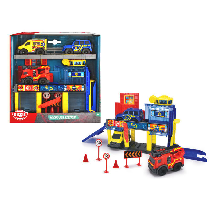 Included: station with elevator, ramp, doors to open, moveable parts, accessories and 3 freewheel vehicles (fire engine, police car & ambulance).